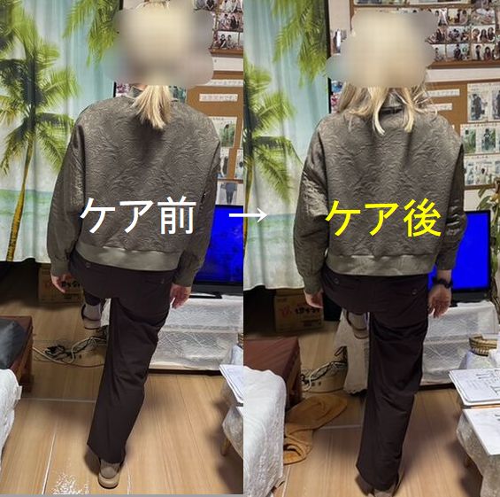 〇ケア後→首肩のコリ腰痛が取れて楽になる。後ろ反りも楽になる(^^)/