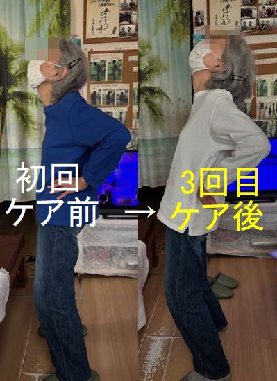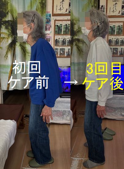 ケア後は当然ながら、立姿勢、動き共に、初回時とは見違えるようになりました。