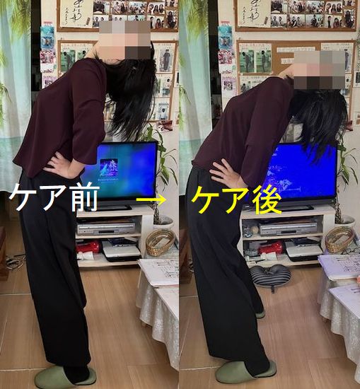〇ケア後→首肩のコリ腰痛が取れて楽になる。後ろ反りも楽になる(^^)/